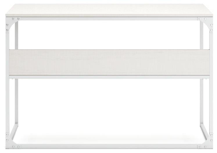 Bring your vision of a modern home workspace to life with this sleekly designed home office desk. Its linear construction and white finish keep things minimal. A small shelf along the back rounds out the versatile, striking desk.